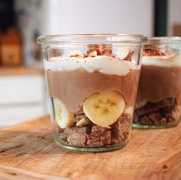 Wenn die Mousse kalt genug ist, erst den Großteil der Cashew-Splitter, dann Banane, dann Mousse, dann Schlagsahne in Gläser geben. Ggf. mit etwas Kakaopulver und den restlichen Schokostücken dekorieren.