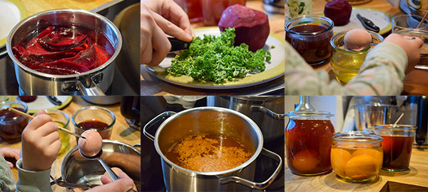 Für den roten Sud hatten wir rote Bete Schale in Wasser etwa 15 Minuten köcheln lassen, für den gelben ein Stück Kurkuma gerieben und mit Wasser kurz aufgekocht. Auf die Eier könne man mit Essig Muster pinseln, bevor sie in den Sud kommen (hatten wir gelesen), noch warm sollte alles sein, dann ginge alles noch besser (hatten wir gelesen) - also kamen die noch warmen hartgekochten Eier in den jeweiligen noch warmen Sud. Nun hieß es warten. In unserer Fantasie hätte man schon nach 10 Minuten einen deutlichen Unterschied sehen müssen, aber Ihr ahnt es schon: so war es nicht. Während des Wartens noch mal das Internet durchforsten... die Eier vorher komplett mit Essig einreiben... hmmm... Eier direkt im Sud kochen... mmm. Uns war klar: hier gibt es noch allerhand Möglichkeiten und der sich nicht einstellen wollende Erfolg nach 20 Minuten ließ uns vermuten, dass unser erstes Experiment gescheitert war und die Testreihe in die zweite Runde gehen muss. Daran änderte sich auch nach 12 Stunden nicht so richtig etwas - am erfolgreichsten war am Ende die rote Bete, aber überzeugen konnte sie uns nicht.