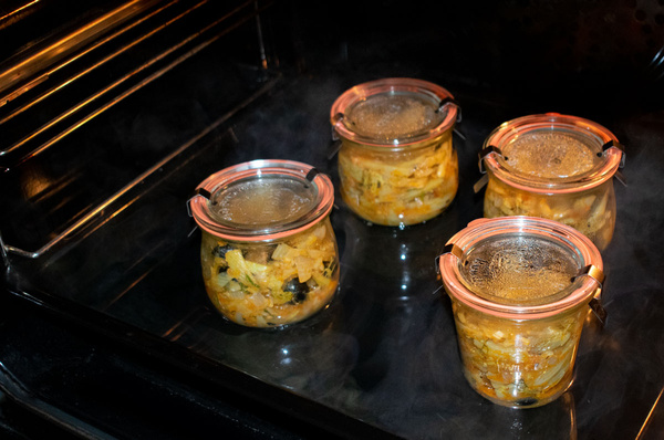 Den Backofen auf knapp 100° vorheizen, 2 Liter Wasser aufkochen. Das Gemüse mit Salz und Pfeffer abschmecken, das Fenchelgrün unterrühren. Das Gemüse bis 3 cm unter den Rand in die Gläser füllen, Deckel aufsetzen. Die Gläser auf das hohe Blech des Backofens stellen. Halb in den Ofen schieben (unten), kochend heißes Wasser angießen, Blech ganz einschieben und die Ofentür schließen. Fenchel ca. 40 Min. einkochen, herausnehmen und abkühlen lassen.