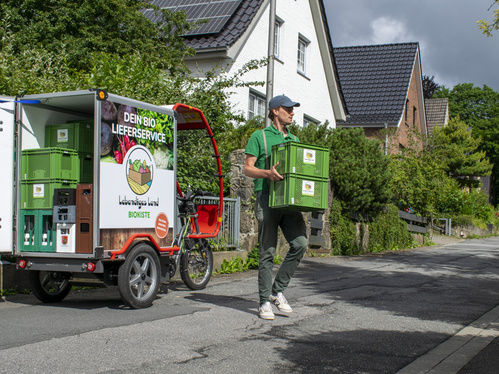 Vieles mussten wir dafür vorbereiten und planen, die Touren entsprechend umgestalten und überlegen, wie wir die Herausforderung meistern, unsere Biokisten trotz des viel kleineren Laderaumes und fehlender Kühlung wohlbehalten auszuliefern. Machbar wird dies durch ein Kühlhaus vor Ort, das gerade noch im Bau ist. Bis zur Fertigstellung nutzen wir ein Kühlfahrzeug als Depot, von wo aus die Kisten in das Lastenrad geladen werden. Zudem finden Kühlprodukte nun ihren Platz in Pfand-Thermoboxen mit Deckel, damit die Kühlkette nicht unterbrochen wird. Da der Platz im Koffer des Rades begrenzt ist und die Kisten sich so kurz wie möglich darin aufhalten sollen, wird die Tour in zwei Etappen ausgeliefert. So erreichen alle Kisten in gewohnter Frische ihr Ziel.