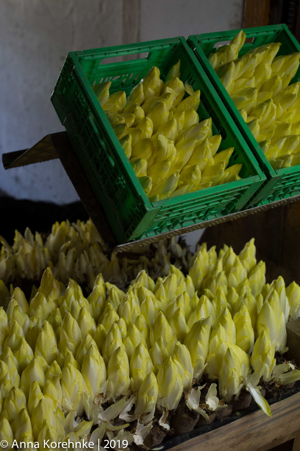 Wirklich spannend ist die Entstehung dieser Chicorée-Knospen: Zunächst wird im Mai und im Freiland die Saat der Zichorienwurzel ausgebracht. Zwischen September und November erfolgt die Ernte, das Grün wird entfernt und sie werden in Kühlräumen bei -1 bis +3°C gelagert. Durch dieses Herunterkühlen wird den Pflanzen eine Winterperiode vorgetäuscht und die sie nun bereit für den nächsten Schritt. Das Austreiben der Knospen. In einem konstant warmem Raum werden sie aufrecht in Kisten gestellt mit Wasser und einer Nährstofflösung begossen. Aus den Achseln der vorher gekürzten Blätter treiben nun dicke zugespitzte, feste Knospen aus. Unbedingt wichtig ist die völlige Dunkelheit in diesen Räumen. Sie verhindert die Ausbildung des Chlorophylls sowie des nicht erwünschten Bitterstoffs Lactucopikrin in den Blättern, die hierdurch die erwünschte blassgelbe Farbe entwickeln. Nach 20-25 Tagen sind die Chicoréeknospen dann groß genug und es folgt das sogenannte „Brechen“, wobei der Chicorée von der Wurzel getrennt wird. Abschließend werden noch etwaige unansehnliche Blätter entfernt und der Gaumenschmaus ist fertig für die Reise in Eure Biokiste. Genießt ihn überbacken, geschmort, mit anderen leckeren Dingen obendrauf oder untendrunter, als Salat oder einfach zum Dippen.