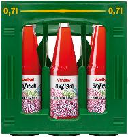 Natürliches Mineralwasser, Himbeersaft* 3%, Rohrohrzucker*, Schwarzer Johannisbeersaft* 2%, Roter Johannisbeersaft* 2%, Traubensaftkonzentrat*, Zitronensaftkonzentrat*, Quellkohlensäure.| Energie | Fett | gesättigte Fettsäuren | Kohlenhydrate | Zucker | Ballaststoffe | Eiweiss | Salz |