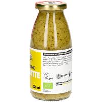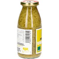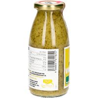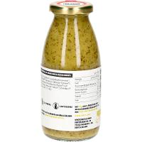 Rapsöl kaltgepresst*, Apfelsaft* aus Apfelsaftkonzentrat*, SENF* (Apfelmost*, SENFSAAT*, Apfelessig*, Steinsalz, Kurkuma*), Apfelessig*, Rapsöl kaltgepresst mit Knoblauchöl* (Rapsöl* kaltgepresst, Knoblauchöl), Meersalz, Petersilie*, Kerbel*, Schnittlauch*.| Energie | Fett | gesättigte Fettsäuren | Kohlenhydrate | Zucker | Eiweiss | Salz |