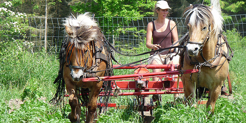 Auf dem schönen Bioland-Hof Großholz, mitten auf der Halbinsel Schwansen zwischen Ostsee und Schlei läuft alles in traditioneller Handarbeit und statt Traktoren kommen hier Arbeitspferde zum Einsatz. 6 Norweger-Pferde ziehen also mit z.B. der selbstgebauten Sämaschine in aller Ruhe ihre Bahnen über die Felder.