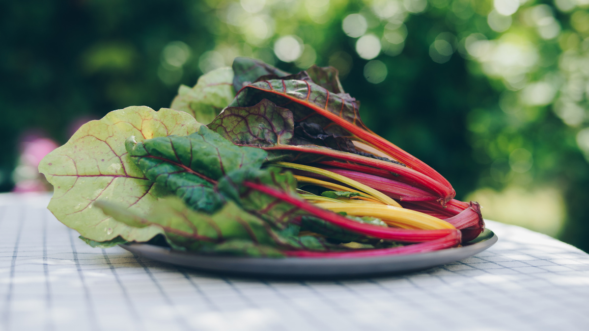 Mangoldstiele und Mangoldblätter waschen. Stiele in 2 cm große Stücke schneiden, Blätter grob hacken. Stiele im kochenden Wasser 5 Minuten blanchieren, Blätter 3 Minuten blanchieren.