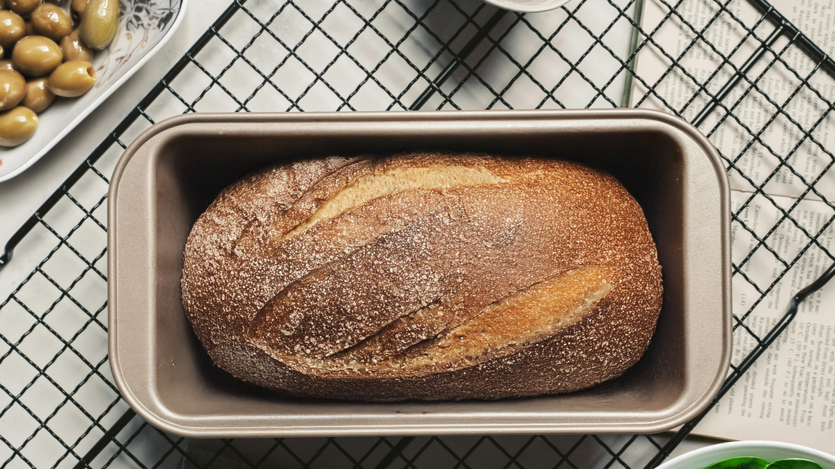 Den Backofen auf 180 °C Ober-/Unterhitze vorheizen. Eine Brotform mit etwas Öl einreiben und mit Mehl bestäuben.