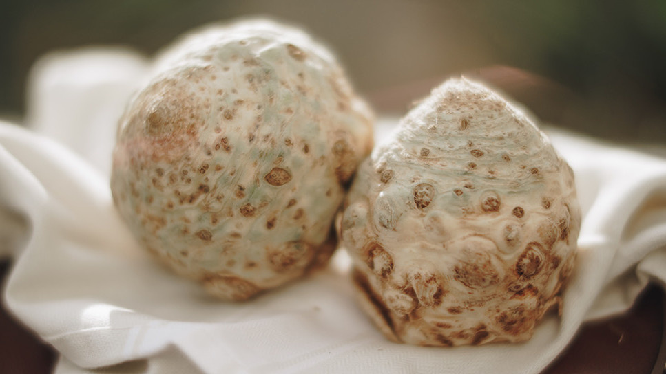 Sellerie schälen, waschen und in feine Stifte hobeln oder