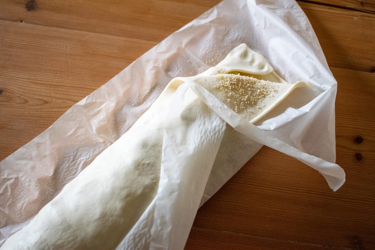 Das Gemüse auf eine Seite des Blätterteigs geben (auf längs) - dabei ca. 3 cm Rand lassen. Den vorderen Blätterteigrand hochklappen, die freie Seite des Teiges mit Hilfe des Backpapiers darüberschlagen und andrücken. Die Enden verschließen.