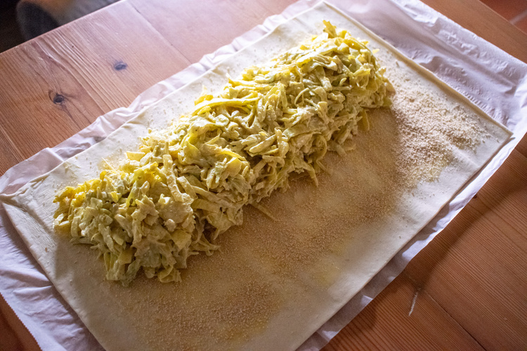 Das Gemüse mit Creme Fraìche vermengen. Etwas Butter zerlassen, den ausgerollten Blätterteig damit bestreichen und Paniermehl darüberstreuen.