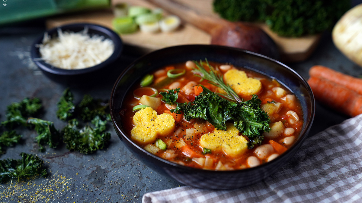 Eine wärmende Suppe mit saisonalem Gemüse, Polenta-Einlage und Grünkohl-Chips